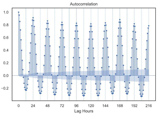 Finally, the autocorrelation analysis represents the correlation of the demand at a certain hour to its lagged values shown in Figure 12 indicating which previous hours of the demand hold the highest correlation to be used as predictive features in STLF [21,58].