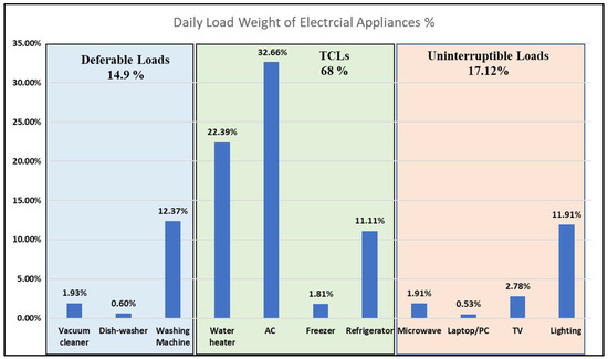 Very few studies discussed the possibilities of DR and DSM in Jordan. Tawalbeh et al. addressed the potential of residential peak shaving to reduce peak demands [38]. They showed that an average of 3.5 kWh of peak load reduction per day could be achieved through adjusting the residential tariffs in peak times from 5 to 8 pm, using TOU pricing. Another research conducted by Jarad and Ashhab emphasized the potential for energy saving in the Jordanian residential sector through energy efficiency measures, where they reported a saving of 15% in energy consumption and 22% in cost could be achieved through the use of efficient lighting and solar heaters by applying for an hourly analysis program (HAP) software [38]. The insight gained from these studies highlights further the potential of DR in giving more incentives for residential and commercial users to pursue energy-efficient electrical appliances and usage. However, this potential has not yet been exploited because there is no understanding of the factors that amplify this potential. This is mainly due to the lack of a conceptual framework and methodological approach that can be applied to a robust data set to quantify the main implications of using DR applications in the Jordanian power sector. This research aims to fill the gap by presenting a detailed day-ahead price-based demand response model for the residential sector in Jordan with the following contributions: