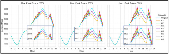 The main objective of the DR program is to reduce energy consumption from costly peak power suppliers. Figure 22 shows the amount of saving in electricity usage from IPP3, which is the most expensive power plant, where both cases C8 and C7 achieved the highest savings, especially at 250% peak pricing. It is also notable that, the worst-case scenario (C6) at 300% peak pricing also achieved savings, which is mainly because the new high peak formed at 9 PM has a smaller width (time horizon) than the original peak and drops more sharply, whereas, for the peak formed at 3 PM, PV power was available. This shows the importance of shifting demands towards periods where renewable energy is available, where in this case, even if the peak demand increased, the overall demand from IPP3 can still be reduced. Cases [C3, C4, C7, C8] achieved better savings in both self-elasticity scenarios, since 25% of the demand reduced at each hour in the peak period is removed from the grid.