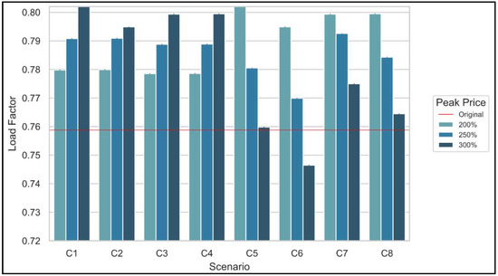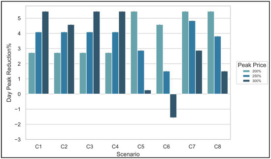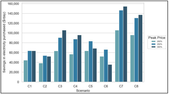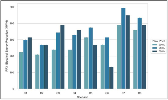 Figure 23 shows the energy cost savings in all scenarios. Energy cost-saving does not follow the same pattern as energy saving because the decrease in electricity purchased from IPP3 causes an increase in IPP4 power usage in hours, where the demand rises from 2 PM to 4 PM and 9 PM to 11 PM. The best- and worst-case scenarios in cost-saving are C7 at 300% peak and C2 at 250%, with the detailed results of the peak reduction, load factor, and cost-saving for each case scenario are reported in Table 14 and Table 15 and the best results based on peak prices for each case are highlighted in green.