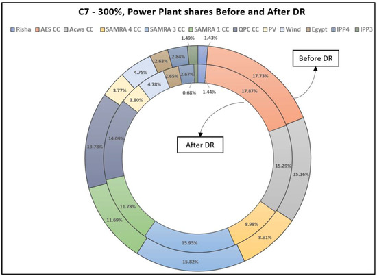 The highest energy cost reductions do not align with the other indicators, ranging from 66,149 to 154,505 dollars. This indicates that the prices should be set based on the priority of the GO, whether direct profit in terms of cost-saving has higher priority or indirect profits by peak reduction and load factor improvement that increase operational performance. The power plant shares for the C7 having the best cost saving at 300% peak price can be seen in Figure 24, where the share of power purchased from IPP3 was reduced from 1.49% to 0.68%.