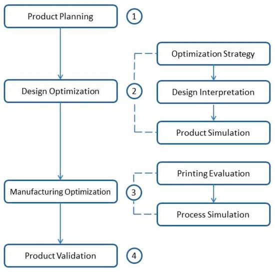 As suggested in Figure 1, from a macro point of view, traditional DfAM holistic workflow involves four main phases described by local tasks to be performed [21]: product planning, design optimization, manufacturing optimization and product validation. Product planning activities include modelling preparation of base design, definition of objectives and constraints, finite element analysis and feasibility analysis to include a structural optimization strategy. Design optimization involves an iterative process of: design optimization strategy; design interpretation of optimized results and product simulation. Manufacturing optimization actions imply printing modeling with support generation, optimization of support structures, and additive process simulation. The last phase involves part manufacturing, post-processing, performance validation via mechanical testing and quality inspection.