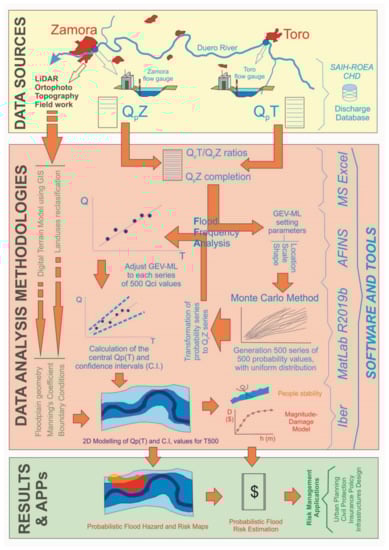 47]. As these are not representations of tangible objects or strictly deterministic variables (as they are in a topographical, geological or vegetation map), the elements and immaterial variables represented (hazard or risk) are of a potential future nature and, therefore, stochastic. This stochastic component can be derived both from the hydro-meteorological methods of estimating flood discharges and from the flood frequency analysis, which use probability distribution functions and parameters such as the return period or the probability of exceedance. However, it can also come from the spatial–temporal probability of the location of exposed elements (people, material goods, commercial and service flows) and their vulnerability, which do not remain constant in time and space, and therefore must also be assigned a probability of occurrence.