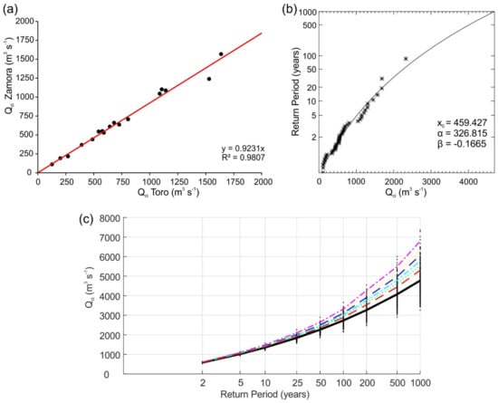 Figure 3b). This FFA gave us the GEV parameter values, which were used further in the MC analysis. The values of the GEV parameters were then used to transform the 500 series of probability values (according to a uniform distribution) into series of instantaneous maximum annual flow values. For each of these 500 series of peak flows, a GEV distribution function was fitted again to obtain the maximum instantaneous peak flow values associated with the different return periods considered in the study, as well as the confidence intervals of this estimated value. The results of the MC analysis for Zamora city are shown in
