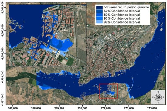 53]. Finally, a flood risk analysis for critical infrastructures, such as nuclear power plants, large reservoir dams, industrial poles and the like, requires cartographies that make it possible to remain on the safety side, using the maximum magnitude and minimum probability confidence intervals when selecting their location, design and dimensioning [