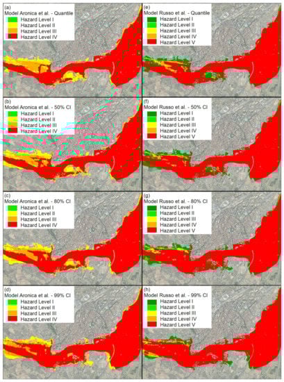 Figure 5) a predominance of the highest hazard level, from the results associated with the hydrodynamic modelling of the quantile value associated with that return period (extending this maximum hazard zone as we consider the different confidence intervals). Differences between the two models considered can be observed, so the Aronica et al. [