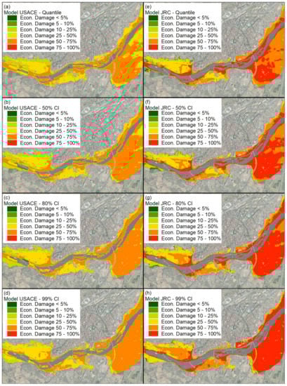 45] models. The first observation that can be made of the results is associated with the maximum level of damage reached in each model. This factor is conditioned by the different maximum percentage of damage considered in each model: 71% in the USACE model versus 100% in the JRC model. However, there is a certain parallelism in the distribution of areas for both models (