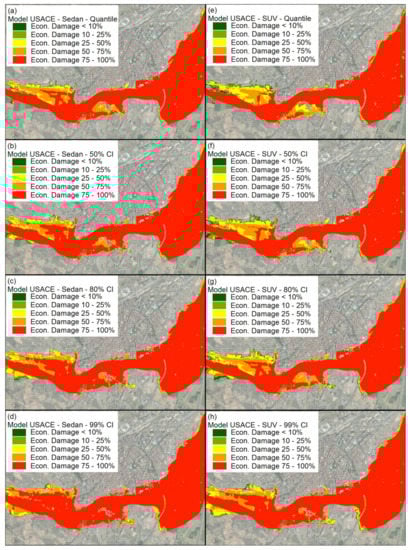 Figure 7). These damage percentages are higher for sedan-type vehicles than for SUV-type vehicles since the USACE damage model considers (for flow depth values of up to 2 metres) the damage to sedan vehicles to be between 10 and 15% higher than the damage to SUV vehicles.