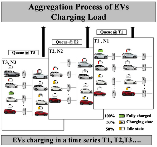 The schematic diagram for EVs charging process with a dynamic queue model.