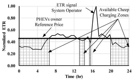 The developed queue charging model uses the owner’s preferences to manage demand and guarantee user satisfaction. Two factors are required from the owner: the owner preferred price-setting OPR and the EPTD. A real-time electricity tariff rate (ETR) variation is illustrated in Figure 4 hence, each owner can adopt his OPR, at which the battery starts charging. Related to the preferred price (see Figure 2) the marked portions represent cheap electricity prices to decrease the total cost of the charging where the cost can be calculated as