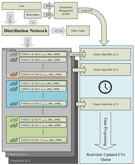 Figure 6 shows the implementation of the proposed DSM for a set of EVs connected to bus k at instant time T. The figure demonstrates the interface of a single EV with the grid. The EVs status is updated at the instant time with four control variables , , , and . When the is greater than the ETR, the queuing algorithm generates the waiting time Tq, and the time spent in the system Ts for each EV. The controller then decides when the battery should charge or be idle. After the demand is determined, the total EV load is added to the classical demand, then the QSTS simulation is applied to compute a 24-h simulation period.