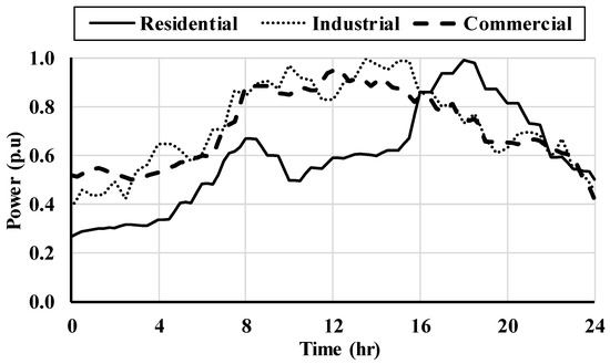 The IEEE 123 nodes test feeder is used to studying the feasibility of the proposed DSM for EVs charging load. The data of the feeder are extracted from [50]. Three different classical load profiles (residential, commercial, and industrial) are used as shown in Figure 7. Sample time of 1 min is chosen to run the QSTS. The QSTS is implemented using a sequential power-flow solver that is based on forward/backward sweep and programmed in C++ with a personal computer (Core I7, 2.66 GHz processor with 8 GB RAM). The nodes of the IEEE 123 test feeder are categorized into three types: residential, commercial, and industrial [46]. The residential demand is assumed to involve 40% of EV’s power penetration level with respect to the total demand of IEEE 123 nodes test feeder, hence, 400 EVs are used. It is assumed that all EVs use GMEV1 battery type, and it is satisfactory for the battery to reach 90% SOC.