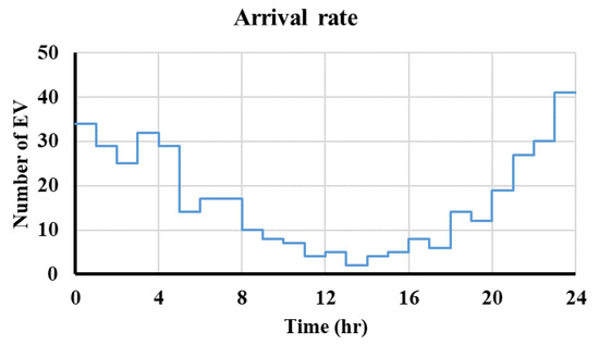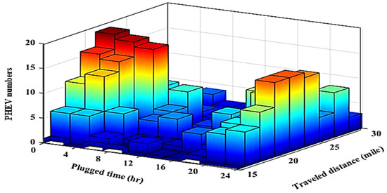 In this work, for real-time management of the EVs charging based on the queue model, a set of data is generated to represent the arrival of electric vehicles into the grid. a non-homogeneous Poisson process is used to represent the arrival rate which is dependent on the statistical model of EV as shown in Figure 8. Furthermore, the battery’s characteristic is considered in the charging service rate and the number of servers’ changes based on the ETR. The pdf for the traveled miles and plugged-in time is used to distribute the 400 EVs randomly. The generated EVs distribution is used as input data to test out the proposed method. The lognormal distribution for the traveled distance is carried out using the mean value of 22.3 miles and the standard deviation of 12.4 miles. The plugged-in time is distributed normally with a mean of 1:00 AM and a standard deviation of 5 h [51]. The results of this algorithm are shown in the 3-D plot in Figure 9.