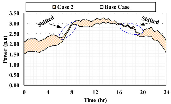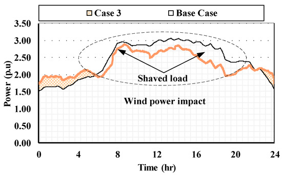 In this case, wind power generation (see Figure 13) is used with the EV’s DSM. The impact of wind energy intermittency on the total demand is illustrated in Figure 15 and it can note that the wind power generation shaves the peak demand caused by the EVs charging and the impact of the wind power in the EVs charging behavior is described in the next subsection.