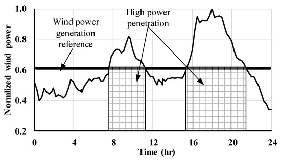 This case study gives a new vision of how the integration of renewable energy resources can be more useful for both generations and the load side. The wind power generation is integrated with the IEEE-123 node system, with the maximum penetration of the wind power chosen to be 20% of the total demand of the IEEE-123 node. It is assumed that when the wind power generation is more than 60% of the total penetration the DSM should reduce the ETR to the minimum value. As such, the connected idle EVs can charge the excess generation power instead of shutting down generation units or using wind power curtailment. Hence, the change in ETR in the existence of wind power is exhibited in Figure 14.