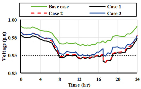 To present the impact of the EV charging on the power system voltage profile, the QSTS is carried out and the voltage of all phases at each bus is calculated for 24 h. Figure 16 shows the impact of the EV charging on phase # a at the worst-case bus 114. The voltage profile in case1 and case 2 is lower than the limits of 0.95 p.u due to the EV charging. However, using the DSM with wind power generation increases the voltage to be within the limits as presented in case 3.