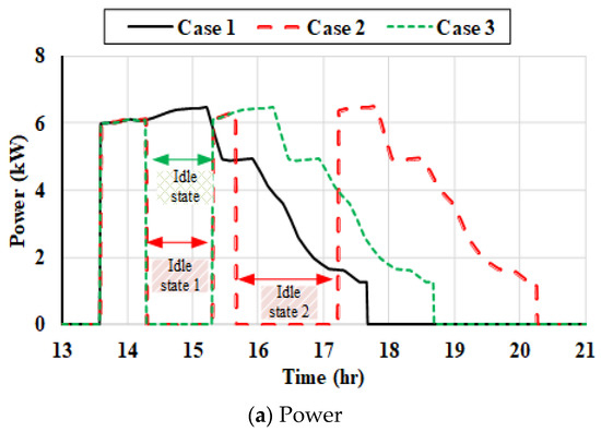 Table 2 gives the initial parameter for the three arbitrary EVs, SOC is 40% for all selected EVs however, they have different plugged-in times. Each EV has a different owner preference variable. Figure 17a,b displays the operating power and SOC of EV#i respectively. In the case of no control (Case 1), the battery starts charging at the plugged-in time 09:23 whereas the battery stops charging and gets disconnected from the grid when the SOC reaches 90%.