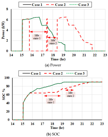 However, EV#i starts charging in the morning, and the ETR is not high as in the evening, the saving is 7.6% and 34.2% in case 2 and case 3 respectively. Finally, all the EVs reach the specified SOC while the overall connected time is less than each owner’s EPTD.