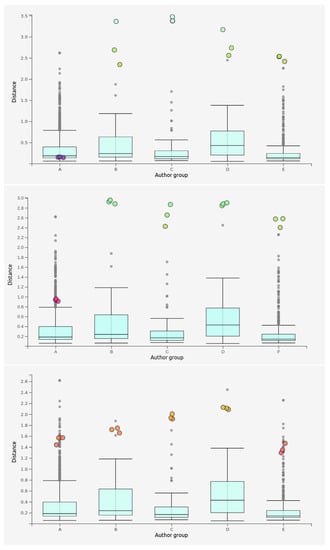 Inter-class closeness is the measurement of the absolute distances among malware to verify whether the target malware is close enough to the nearest neighbor. The measurements were compared according to the distance distribution within the same author group chosen for comparison. Specifically, let and denote the target malware and the chosen nearest neighbor of , respectively. Let be the distance between and . Then, is checked to determine whether it is an outlier or not based on the distance distribution between malware belonging to ’s author group. If the value of is outside of the interquartile range (IQR) obtained from the box plot analysis [27], we consider as the outlier, which means that classifying would be risky because the distances from each author group to are considerably far.