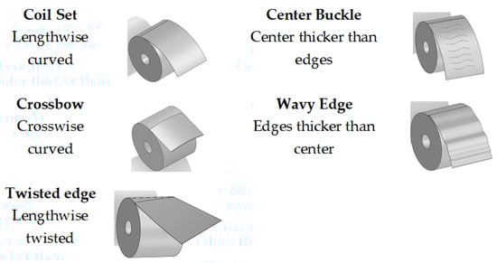 The metal forming industry is considered the main part of mass production in the automotive, electronics, telecommunication, and construction industries. In the metal forming industry, sheet metal coil has been widely used in either metal stamping or laser cutting. In each coil, there are always different common symptoms of unleveling problems, as shown in Figure 1 [1]. The five common symptoms are coil set, crossbow, twisted strip, center buckle, and a wavy edge of the coil. The most common symptom of an unleveled coil is coil set, which is caused by the way the sheet metal is stored and packaged with a surface-to-surface length differential [2]. Coil set can easily be leveled or flattened by a roller leveler with entrance and exit gap adjustment to the rolls. On the other hand, center buckle, wavy edge, and crossbow are lateral (width) lengthwise differences and require leveling in the lateral direction [3]. Due to the increase in sheet leveling quality demand in recent years, leveling in a lengthwise direction can no longer be sufficient for a much higher quality application. As a result, lateral leveling has become a crucial point for leveling quality to deliver high-quality products. In this paper, the research will be focused on the lateral leveling of coil sheet metal.