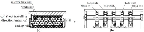 The schematic drawing of the model leveling machine can be seen in Figure 2. As illustrated in Figure 2a, the sheet metal coil is fed through between the top layer and bottom layer of the leveling machine. The leveling machine consists of work rolls, intermediate rolls, and backup rolls. The work rolls are in direct contact with the sheet metal. The intermediate rolls act as a pressure distribution buffer between the backup rolls and work rolls. As is shown in Figure 2b, five backup roll sets, which are placed evenly along the sheet’s lateral direction but with rolls in each set packed similar to the work rolls and intermediate rolls along the sheet’s traveling direction, are used to support the work roll through the intermediate roll. In addition, the five backup roll sets are used to prevent the deflection of the work rolls while leveling the coil sheet material. The other main purpose of the backup roll sets is shape correction, particularly for the coil sheet’s lateral leveling process. Therefore, backup roll adjustments were our primary focus for this paper.