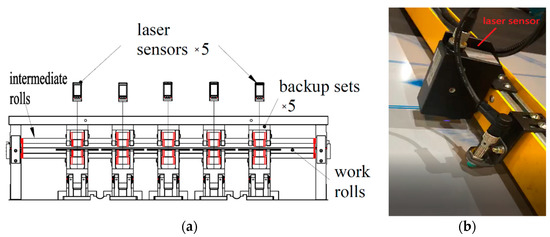 In this research, five laser sensors were used to measure the sheet metal surface during a leveling process with a line speed of 12 m/min as shown in Table 1. As shown in Figure 4a, each of the sensors was placed on the sensor bar in line with where the backup roll set was placed; that is, the five laser displacement sensors were installed along with the backup set along the steel sheet’s lateral direction. Therefore, in such placement, the sensors could measure the waviness or flatness of the sheet and be used as a feedback signal to the system to adjust the actuation of each of the five backup rolls. Figure 4b is shown to demonstrate where the sensor was placed in the system. The sensors’ readings were based on the triangulation principle [30], where the laser beam is enlarged into a line and projected onto the surface of the object to be measured. The root mean square and average height deviation were calculated within the system.