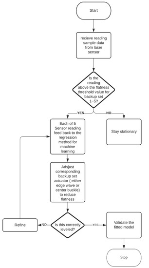 In this research, the training data used were the previously recorded data from flatness verification against the machine operator’s input value while applying the leveling process during production. The sample data were then applied using multiple regression as a training model to predict the parameters for the leveling process. The machine learning workflow of this research was based on a flowchart, as shown in Figure 5. The measuring system was set up at the exit side of the leveler, and each of the sensors was placed at the same position as each of the backup sets. Therefore, each laser sensor could measure the flatness of the sheet at the location leveled or corrected by each of the backup sets. The system was initiated by receiving reading sample data from the laser sensor. After receiving the value, it checked whether the value was above the flatness threshold. If the value was above the threshold, the sensor reading was fed forward to the multiple regression model for the machine learning process. After the value was predicted, each backup set was adjusted based on the calculated value to achieve an optimized value for flatness. The backup set was adjusted up or down through the servo motor to deform the work roll as shown in Figure 3 according to a different application. Finally, the learned regression model was validated in this research.