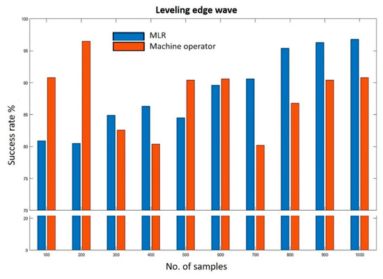 During the leveling of edge waves, the backup sets need to provide slightly tight space in the middle and loose space at the edges so that the sheet can expand laterally toward its two edges and make it flat. The results, shown in Figure 6, indicate that as the number of samples increased, the regression model could offer a success rate over 96%, whereas the experienced machine operator apparently was capped by a ceiling. The experienced machine operator may have produced a relatively good success rate when the number of samples was small. However, when the number of samples increased, the operator’s “experience” may not have been good enough to make the proper judgement in adjusting the backup sets. In general, the experienced machine operator was shown to provide a success rate of around 80~90% during all of the 1000 test samples, which apparently was not as good as the results generated by the proposed method. Additionally, in comparing the results of the regression model and the machine operator, the regression model was shown to be more consistent for the success rate. Due to the edge wave possibly not being the same for both edges, it was harder for the machine operator to use solely experience for trials and errors to keep the leveling results consistent for the entire process. As a result, the regression model was shown to have a higher success rate and a more consistent for the edge wave leveling application.