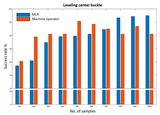 In the center buckle leveling process, the backup roll set needs to be tight on the edges and loose in the center. The results, shown in Figure 7, offered a success rate over 97% with the regression model over 1000 samples. On the other hand, the machine operator was shown to have a success rate varying between 80% and 95% when the test samples became large. In this application, although the machine operator and regression model were shown to have similar outcomes, the consistency for the regression model was also shown to be greater for the buckle leveling process over 800 samples. From the results, it was observed that the machine operator was shown to produce fluctuating results, primarily because the trial-and-error approach based on experience could not show the ability to adapt to the variation as quickly as the regression method.