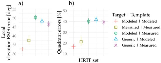 Auditory-model-based predictions of the (a) local () elevation RMS error and (b) quadrant errors (). The error bars denote the bootstrapped 95% confidence intervals of the mean. The applied model is the Baumgartner et al. [34].