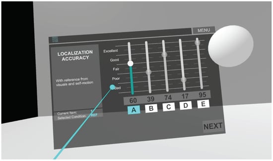 The scenes Above and Below were evaluated on a separate day in a follow-up experiment by a subset of 8 participants. The rest of the scenes were evaluated in one main experiment, one after the other by all of the 12 participants. The presentation order was fixed to start with localization, followed by timbre, and finishing with overall quality. The participant was presented with a multiple stimuli quality scaling task in VR, where the localization accuracy, timbral fidelity, and overall audio quality were to be rated on a 100-point continuous scale, depending on the task. There were verbal labels marking the regions of the scale as bad, poor, fair, good, and excellent in 20-point intervals. The five HRTF conditions were presented side-by-side in the VR user interface, and the participant was allowed to switch between them. The HRTF conditions and interface buttons were randomized for each scene. The interface is displayed together with the sphere denoting audio object location in Figure 4.