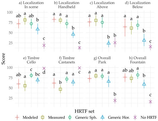 Subjective scores from the 6-DoF VR experiment. Panels (a–d) display results from the localization scenes, panels (e,f) timbre scenes, and panels (g,h) overall quality scenes. The error bars denote the bootstrapped 95% confidence intervals of the mean and the letters denote the significant differences () between conditions calculated by pairwise permutation tests. Conditions with the same letter are not significantly different from each other.