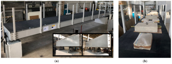 For a better calibration of the numerical model of the FRP footbridge (Section 4.3), the static response of the structure was initially assessed employing twenty sandbags, which total weight was 300 kg (15 kg each) and four concrete blocks, which total weight was 760 kg (190 kg each). These elements were uniformly distributed over the bridge deck, as shown in Figure 3b, to obtain a static load of 0.70 kN/m. The deflection measured at mid-span with a dial comparator was 12.8 mm.