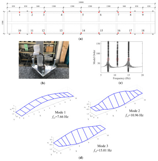 OMA: (a) Location of eighteen accelerometers. (b) Picture of accelerometer No. 5. (c) Stabilization diagram. (d) First three vibration modes of the structure.