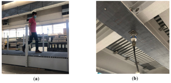 The dynamic behaviour of the footbridge was assessed under the action of a single pedestrian walking at a step frequency of 1.9 Hz. Six test subjects, which mass is presented in Table 2, were asked to cross the bridge 3 times, walking along the center lane. Figure 5a shows the third trial of the Test Subject 2. An accelerometer attached to the bottom of the central stringer was employed to collect the footbridge response at midspan, as displayed in Figure 5b. The step frequency was controlled using a metronome and chosen aiming to synchronise the fourth harmonic of the human action with the fundamental frequency of the structure. Additionally, the human velocity in each trial was measured, obtaining a mean value of m/s.