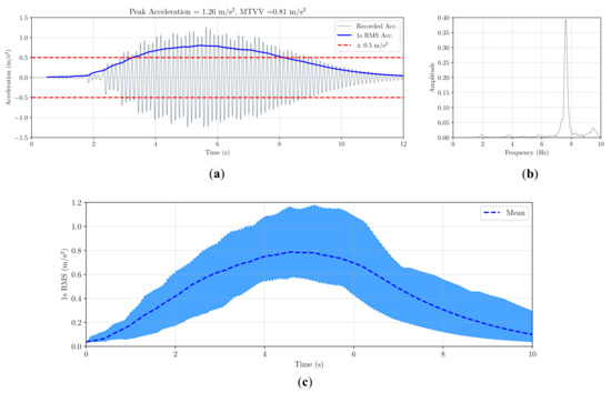 The eighteen recorded signals (three per person) were processed using a band pass filter with an upper and lower cut-off frequencies at 1 Hz and 10 Hz, respectively. Figure 6a,b shows the acceleration response in the time and frequency domain when the Test Subject 2 crossed the bridge once. Also, the 1s running root-mean square (RMS) acceleration is included in the graph together with the peak response and the maximum transient vibration value (MTVV). Both results exceeded 0.50 m/s, which is the acceleration limit for a maximum degree of comfort stated in HIVOSS guideline [13] and Eurocode 0 [16]. Clearly, the analysed footbridge shows a significant response due to the fourth harmonic of the dynamic pedestrian action.