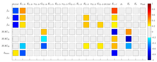 A stochastic sampling strategy was used to perform the analysis, so the Latin Hypercube Method was employed to generate 1000 multivariate stochastic samples of the mechanical properties. Using the properties of the elements shown in Table 3, different samples for the GFRP mass density (), GFRP stringers (), GFRP crossbeams (), GFRP deck (), CFRP mass density (), CFRP strips (), concrete blocks (), steel connectors (), and non-structural mass () were generated. Figure 8 shows the results through the Spearman correlation coefficient matrix, in which values between are excluded for a better visualization. From this matrix, , , , , , , and were identified as influential properties on the structural behaviour of the FRP footbridge. Therefore, the seven parameters were selected as variables to be calibrated.