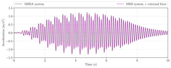 Employing a modified version of Caldintav [43] software, the dynamic analysis of the FRP footbridge considering this HSI model (MSD system + external force) was addressed. Figure 13 shows the results employing both approaches. The peak acceleration calculated at mid-span using the mentioned software was 1.33 m/s, whereas the maximum response using the closed-loop TF () was 1.30 m/s. As shown in the graph, similar results were obtained by employing the model that accounts for a MSDA system and the model that considers a MSD system with an external force.