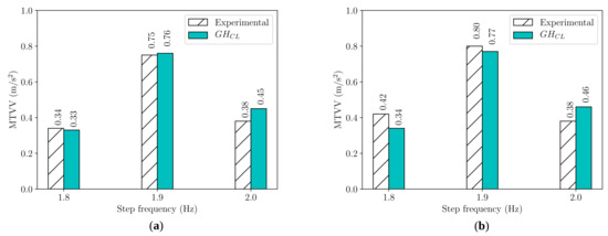 From the recorded acceleration response at midspan of the footbridge, experimental MTVVs were obtained. Whilst the numerical values were obtained using the the mass of each test subject and the parameters of the identified MSDA system. Results accounting for both pedestrians are displayed in Figure 14. When the fourth harmonic of the walking human ( Hz) was synchronized with the structure’s fundamental frequency, the highest structural response was obtained. For the tests with both humans, experimental and numerical results show a good agreement, obtaining a relative error between the MTVVs less than 5%.