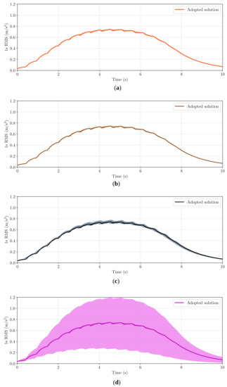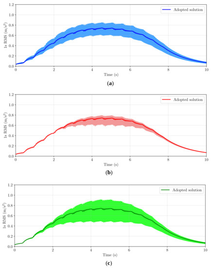 From the experiments carried out by the six pedestrians, the mean 1s RMS was computed using the sets of collected data. The outcome is displayed in Figure 6c, in which the colored band represents the dispersion of the results obtained from the eighteen records. The width of this band corresponds to the minimum and maximum values.