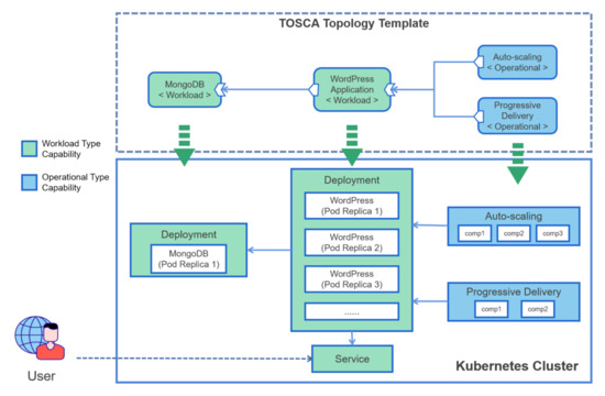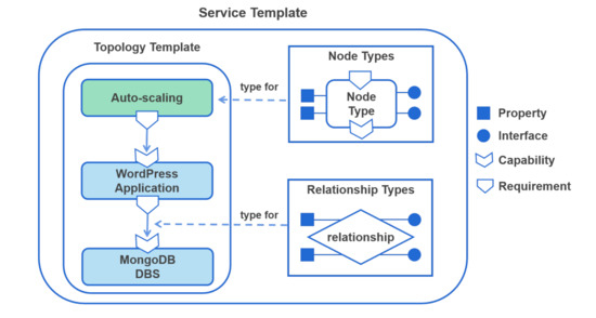 Our orchestration approach leverages existing cloud orchestration standards, the most relevant ones of which are TOSCA (Topology and Orchestration Specification for Cloud Applications) and OAM (Open Application Model). OASIS TOSCA is an OASIS standard that aims to enable portable specification of cloud applications. According to the standard, an application topology is defined in an underlying platform-agnostic way in order to promote the application interoperability and portability across different cloud providers [7,8]. To define the topology of applications, TOSCA provides a type system that can model applications’ components as typed Nodes and relationships among the components as typed Relationships. Besides basic properties and interfaces, typed Nodes and Relationships also have Capability and Requirement by which application designers specify dependencies among components in terms of component functionalities. A component may be defined to provide a certain ability as a typed entity or require an ability also defined as a typed entity provided by others. As an example, consider a WordPress application, connected to a MongoDB database that can adapt to input fluctuations with auto-scaling capability enabled. As shown in Figure 1, the application can be defined as a TOSCA service template that is composed by a Topology Template along with accompanying types. In other words, the application’s parts and their relationships can be modeled and specified using the TOSCA vocabulary. Additionally, TOSCA offers rich design primitives for specifying orchestration constraints and behaviors within a declarative service template configuration, such as policy and workflow [9]. Policy can be defined to express non-functional requirements applied to a group of typed nodes. Workflow is also known as Plan in TOSCA that includes a set of sequential tasks for fulfilling a certain orchestration task. Our approach employs the TOSCA standard as a domain-specific language for describing the topology of applications and defining their orchestration workflows.