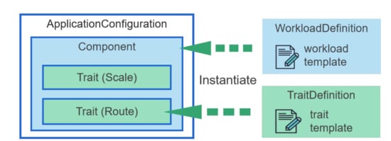 OAM is a runtime-agnostic modeling and specification standard for defining cloud applications [10]. Focused on the application layer rather than underlying platform resources or the infrastructure layer, OAM aims to model applications in a modular, extensible, and portable way, enabling application delivery to diverse target platforms. Distinguishing between parts that application developers and operators are responsible for, OAM argues for separation of roles’ concerns when defining applications. With regard to the standard, an application is composed of two parts mainly; the first is the component inside which the application logic resides to provide its service, while the other is the specification of operational characteristics for the component. More specifically, an OAM component is introduced for application developers to declare a runtime environment where the application runs, which might be containers, virtual machines, IoT devices, or cloud platforms. The runtime environment is also known as workload in the context of OAM. For example, an OAM workload, called containerized workload, represents a standard definition of runtime for containerized applications. On the other hand, an OAM trait is a discretionary runtime overlay that empowers workloads with additional operational features. Examples of it include scaling workloads dynamically to achieve high availability and routing the traffic towards a specific host domain. Both component and trait are designed as reusable templates that can be easily instantiated to compositions of different applications. Application configuration is a top-level OAM resource manifest in which all building blocks of an application are to be instantiated and interconnected. Figure 2 depicts the structure of an application containing one component for a containerized workload with two traits, scale and route, attached, and Listing 1 shows its corresponding OAM YAML snippet.