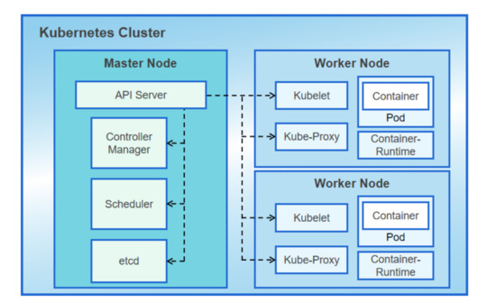 Kubernetes [11] is an open-source container orchestration framework that automates the management of container lifecycle as well as execution of containerized applications. Kubernetes cluster architecture consists of a master node and a set of worker nodes. The master node is responsible for the maintenance and management of the cluster, while the worker node runs a set of Docker containers for applications. This master/slave architecture is illustrated in Figure 3. The minimal deployment unit in Kubernetes is a pod that contains one or more Docker containers and provides shared storage and networking capability for the containers. Several management components in charge of the maintenance of the cluster state are located in the master node, which include API server, Controller Manager, Scheduler, and etcd component. The API server provides an entry point to control the entire Kubernetes cluster, and etcd is a highly available distributed key-value store that keeps data for the cluster state. The Scheduler determines which worker to assign which pod. To bring the system to a desired functioning state, Kubernetes relies on the Controller Manager that consists of a few controller processes such as node controller, job controller, etc. Each worker node is equipped with Kubelet, Kube-Proxy, and Docker container runtime. More specifically, the Kubelet process handles the pod state based on the commands from the master, and the Kube-Proxy process is a network proxy that resides on each node.