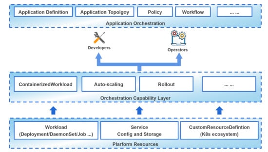 Cloud-native applications are becoming increasingly complicated nowadays, which poses significant challenges to the design, development, and delivery of them [1]. To help application builders overcome the difficulties, PaaS (Platform-as-a-Service) was introduced as a cloud service model that provides a configurable computing platform [2]. PaaS platforms are also understood as DevOps environments that provides viable tools to quickly build, test, and deliver cloud-native applications [3,4]. It provides application builders with supports needed during the lifecycle of an application from development and testing to delivery and operations. The means for provisioning and managing a cloud application may vary in terms of involved technologies and underlying platform capabilities such as auto-scaling, monitoring, and rolling releases of the application. To keep the platform versatile, rich configuration options have to be provided, which would lead to a higher level of flexibility and maintainability. However, not all the configuration parameters may be of interest to ones. Some of the configuration fields are supposed to be used by platform builders, while others are intended for application builders [5]. A single application component might be backed up by multiple platform capabilities, which entails that application builders are expected to understand all the configuration parameters of those underlying platform resources. Obviously, the orchestration will likely be a time-consuming and error-prone task for application builders. When considering the orchestration task for applications built upon various capabilities, it becomes even worse because the task must deal with all the details of resources and capabilities’ configurations [6].