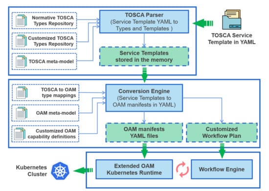 - First, TOSCA Service Templates in YAML files are loaded and processed by the parser in TOSCA module. Besides built-in TOSCA normative types and the meta-model, the parser also consumes a set of types tailored to specifying entities introduced by our approach. Outputs from the TOSCA parser are stored in the memory to be passed on to the conversion engine.