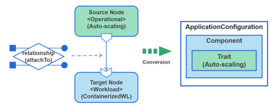 For two nodes connected by an AttachesTo Relationship type in TOSCA, their OAM entities will be organized into an Application Configuration. Specifically, a Trait mapped from an operational capability type is made from part of a Component mapped from a workload capability node. Figure 7 depicts this kind of conversion from TOSCA Template Topology containing the AttachesTo relationship to OAM Application Configuration.