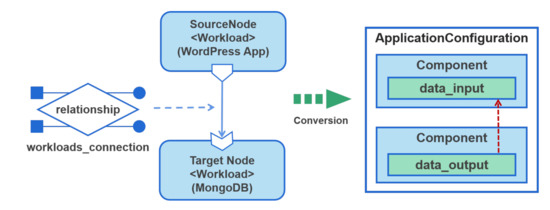 Another important relationship is a dependency between two workloads. As illustrated in our motivational scenario, the connection between WordPress server and MongoDB database is modeled as such a dependency relationship. Different from relationships between a workload and an operational capability, dependency between workloads has no counterpart concept in OAM specification. To overcome this deficiency, we leverage a data transfer mechanism in OAM Kubernetes runtime that permits data passing among components within an Application Configuration. The idea is to create a custom relationship type workloads_connection with two end points. One is the field path to which the target node (producer) writes data as output, and the second is the field path of field from which the source node (consumer) reads input data. The conversion engine sets the data input and output in the OAM components converted from two workload Node templates connected by the workloads_connection relationship template. Figure 8 illustrates this conversion from TOSCA Topology Template containing workloads_connection relationship to OAM Application Configuration.