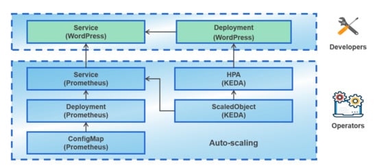 Automatic scaling is an operational capability used to adjust the application capacity to dynamically changing demands [13,14]. It allows the number of the replicas of a particular component to be dynamically adjusted according to performance metrics such as CPU utilization rate or number of requests per second to the application. In our scenario, auto-scaling is applied to the WordPress server Deployment in such a way that the number of replicas is automatically increased or decreased in response to the fluctuation of incoming requests. Auto-scaling capability is composed of two main modules, which are a monitoring module and a scaling one. The former is responsible for monitoring its target component and collecting relevant metrics data, while the latter automatically scales the number of replicas based on its scaling rules.