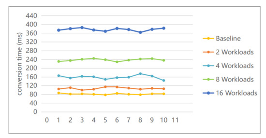 To evaluate the performance of the model conversion engine, we performed a series of conversions of different TOSCA Service Templates into OAM configurations. The motivational scenario serves as a baseline to compare the execution times of the cases with an increasing number of workloads and operational capability nodes. Conversions for the same service template with varying number of workloads were executed ten times. Elapsed times for the model translation are plotted in Figure 10 across different scales of the application. As seen in the graph, the conversion time increases gradually, as the application becomes more complicated.