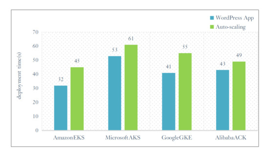The conversion module outputs OAM manifests that are fed into OAM Kubernetes runtime in a target Kubernetes cluster. To evaluate the deployment of applications across diverse cloud environments, we installed our orchestration system on four mainstream cloud platforms including Amazon Web Service, Microsoft Azure, Google Cloud, and Alibaba Cloud. We leveraged managed Kubernetes services of the cloud providers which enables higher availability and better performance than a manual setup in the local machine. We repeated the application deployment for our sample scenario multiple times on each cloud platform and averaged the times taken before the WordPress application becomes available and the auto-scaling feature gets ready. The results in Figure 11 show that our prototype system is able to deploy the application on these cloud platforms within a minute.